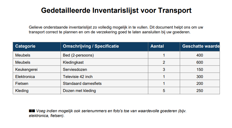 - Een gedetailleerde lijst van de goederen die vervoerd moeten worden
